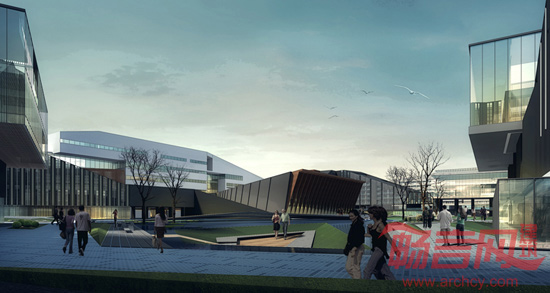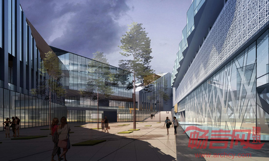 在建筑的细部处理上,本设计注重体现新材料的应用与时代精神的体现。在立面选材上,东南西北外圈建筑采用了白色石材、玻璃幕墙、穿孔板等材料,而内圈建筑则采用了黑色石材、玻璃幕墙、金属材料等等,建筑外墙大多采用可以开启的整片玻璃悬窗,保证玻璃的分割不至于太过细碎的同时也在实用性上满足功能空间的通风要求。整体的玻璃工程与檐口、顶层窗上沿和分层处的钢材装饰构件,使建筑呈现出时代精神。