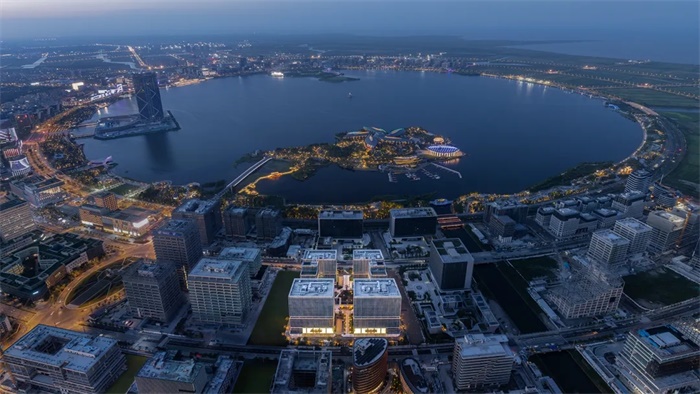 中建东孚以“深耕临港”为目标,全面融入临港新片区发展。位于沿湖一线的是中建长三角区域总部紧邻滴水湖西北角,地处滴水湖沿岸的第一圈层“科创总部湾”,FTA操刀设计两个地块组成的全新协同社区首发区域:中建未来港(商办用地)和中建智慧天地(科研用地),总计容体量约14.5万平方米,总投资超30亿元,集高端商务、研发办公和滨水景观为一体。