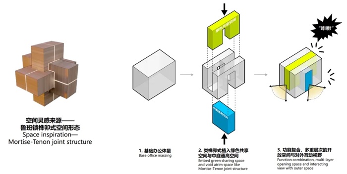 中建智慧天地在延续滴水湖强烈几何向心感的城市肌理基础之上,对周边城市环境进行呼应,创造出围合的“花园”形态空间。灵感来源于鲁班锁榫卯式空间形态,榫卯相互穿插的构件对应建筑中的虚实空间,呼应中建文化《十典九章》,以“内正其心,外正其容”的设计理念,进一步回应中建理性严谨,精益求精的匠人精神。