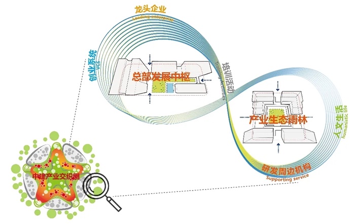 FTA建筑设计将中建东孚庞大的产业体系定义“产业交织圈”,科创基地作为微观下簇生环节,在于形以中建区域总部带动的“总部发展中枢” +“产业生态雨林”的和谐共生发展模式,搭建成集合“产业集聚地+创新策源地+展示体验地+商业服务地”的“云平台”。