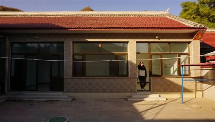 窄巷尽头,便是院落门口,门后建筑屋顶架起一座小小的阁楼。傍晚,粉色内墙所映射出红色的光,照的阁楼如灯,悬于院门口与烽火台之间,温暖的等待着。