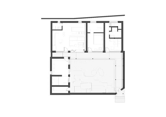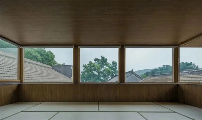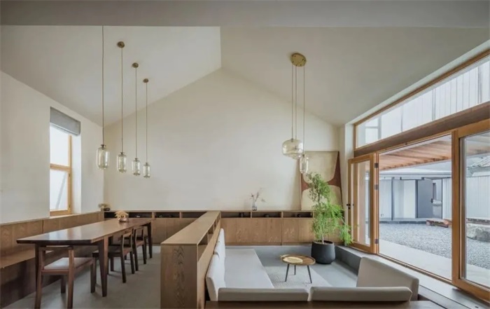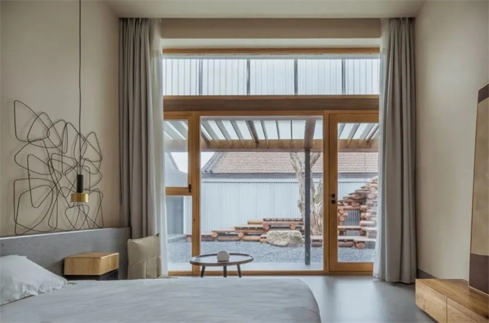 进门来,原本院子有些空旷,于是便沿建筑出挑屋檐,形成宽敞围廊,适宜安坐其下。而压低的屋檐,一方面更为踏实,并且将室内视野上下划分开,其上框景远眺长城,其下实木开启扇的温度感与庭院更亲近连接。室内家具尺度都低矮些,并下沉了休息围坐的地方,放低姿态,换种视角,身体变化或可感知更多可能的美好。