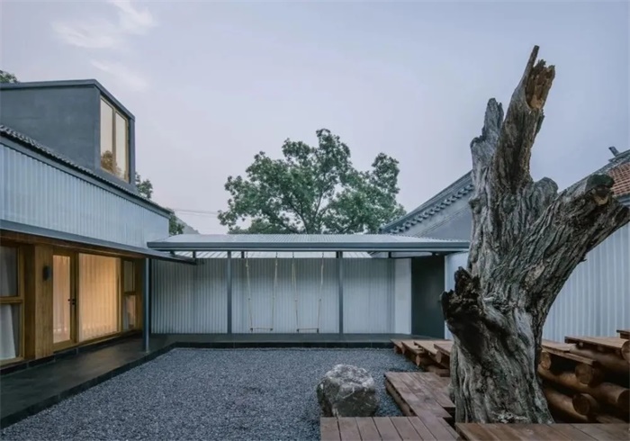 我喜欢堡中的古槐,想把他装进院子。东侧的屋檐调整到合适的高度既屏蔽了杂乱又恰好露出树冠。四周建筑均用银色金属穿孔波纹板包裹,闪烁模糊,净化背景。西侧保留的二层小楼,波纹板之上全部打开,院中不再点缀其他植物,使得玻璃幕墙中的古槐绿影更加突显,吸引着人们登楼一观其全。