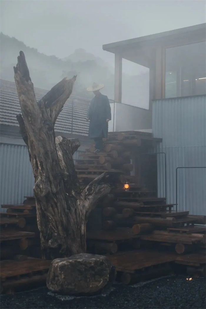 学习叠石也好,模仿前人也罢,我们采用了变化踏步尺度和造型以同时满足攀登和停留的办法。稍有不同的是木头的搭建借用了传统屋架的方式,因我希望它看起来像一座倒塌房屋的废墟,甚至其间还缠绕着一株枯朽的古树,更加荒诞了。遥想梁林两位先生倚靠普化寺梁上的场景,和这里拍照打卡的男女,不知是致敬还是调侃。