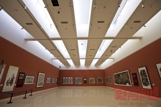 设计充分考虑场地因素对美术馆布局的影响,尽量削弱美术馆庞大体量对周围环境的压力,使公园与建筑互相融合、互相渗透,努力形成“场中有馆,馆中有园”的优美意境,充分体现建筑与园林的互动关系。在整体布局上借鉴传统园林巧于因借、旷奥相济、小中见大、欲扬先抑、明暗相衬、塑造意境等手法,以序列型的陈列馆及三个带中庭的方型实体围绕一个中心庭院来营造空间氛围,同时用曲折有致的通道回廊将各建筑相连。设计充分考虑场地中保留树木的因素,巧于因借,形成以古树为背景的中心庭院和树院。在美术馆建筑这一空间载体的考虑中,并不追求建筑的形式感对视觉的冲击,建筑立面以平缓的直线、简洁的体块来表现地域建筑的刚直与硬朗,外观采用灰白的主调色彩与葱翠的环境融合,以其方正、内敛的气质体现建筑的端庄。外立面以灰白石料为主,以石材自然厚重的质感较好的表现出建筑的抽象性,增强建筑的体积感和雕塑感。