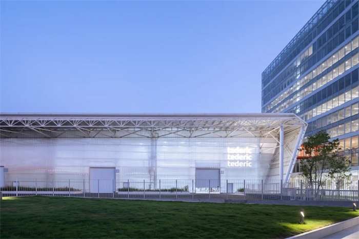 这一理念贯穿于建筑形态的设计中,泰瑞总部通过红桥与智能工厂相连,象征着持续的能量供给。工厂的造型与光影效果如同一颗电池,驱动制造系统的永续运转。以工业为主体的经济开发区使该区在夜晚显得昏暗与不安。设计同时以“城市之灯”为关怀出发点,在夜晚展现出温暖的光线,使工厂成为该区夜景中的璀璨光点,点亮工人们的回家路。