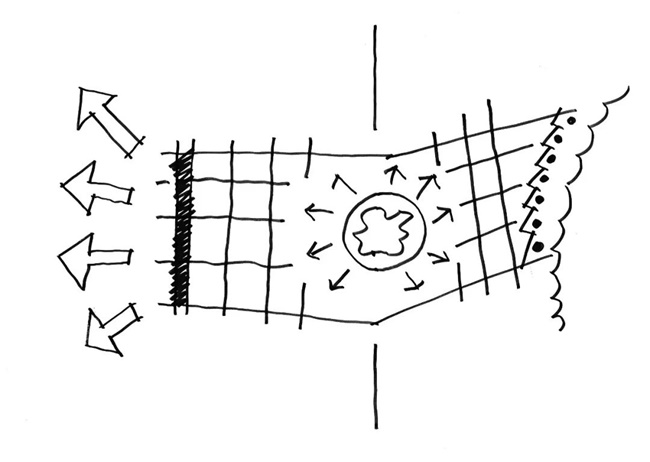 四个单层水滴形建筑体量组成 “公共活力环”,半透明屋顶结构下的室内空间分别为报告厅、小型阅览空间和附属的交流交往空间。“中心绿轴”在地块中心打开并放大形成露天的室外广场,通过景观台阶与“公共活力环”连接,使整个中心广场形成了三维复合尺度的集散场所。