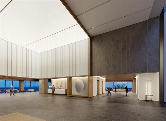 室内空间设计中,酒店大堂空间秉承轻盈风雅的设计语言,在两层挑空区域设置了一个微微发光的灯盒,映射内修、求实的东方哲学。空间以暖色调为主,营造了宁静典雅、自然闲适的静谧氛围。大堂吧被赋予全新定义,成为供宾客畅谈交流、激发创意的社交聚会场所。