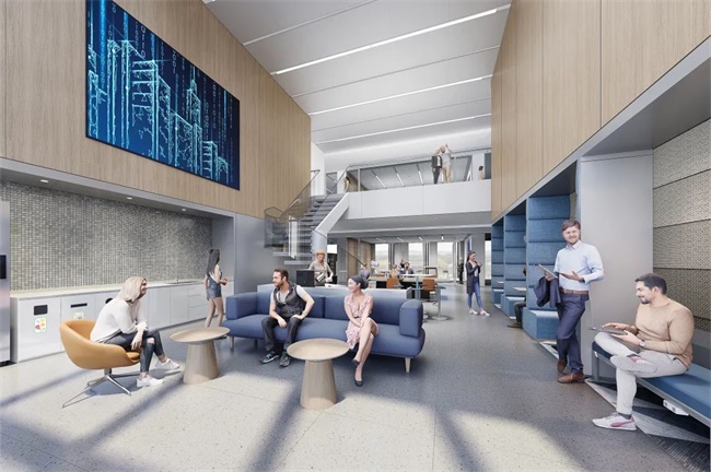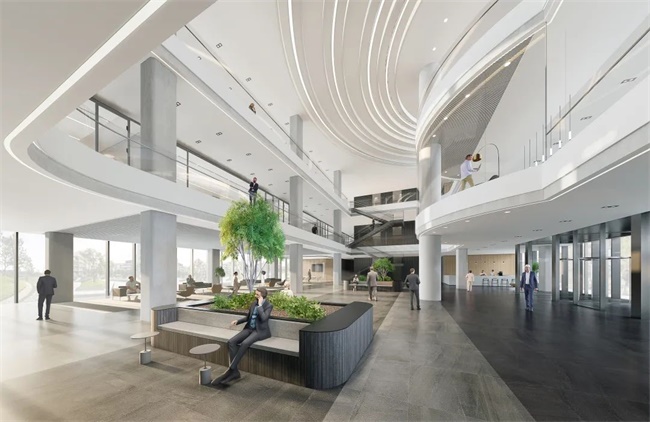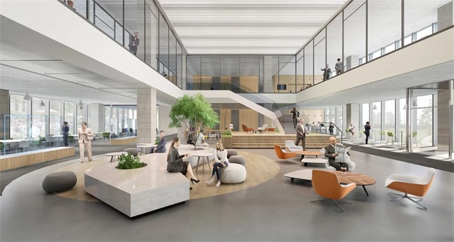 科研办公大堂整体呈科技和未来感,功能均匀分布在中庭四周,保留中庭的开阔空间,使空间层次感更为丰富。弧形的开洞加强了空间的流动感和包容感,简约的流线形设计为科研工作者提供了一个时代前沿的创新氛围。研究型学院内设计了多样化的教学空间,以鼓励激发学生间的讨论与合作。