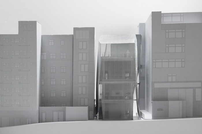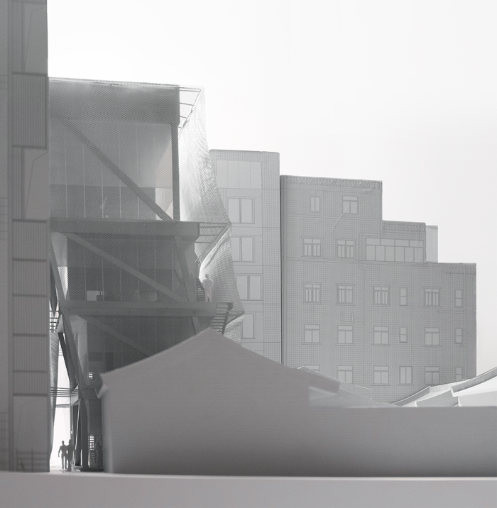 设计在表皮与体量之间创造了可以从地面一直走上屋顶的垂直漫游路径,缠绕建筑而上的竖向动线将公共领域渗透至建筑的周圈乃至屋顶,将不同层的展厅、屋顶平台联为一体,提供了在不同高度和视角观看城中村独特城市景观的机会,而当从城市看向建筑,在朦胧表皮后漫步移动的人影,又赋予建筑一种活跃、动态的属性。