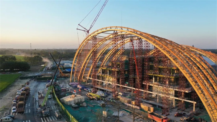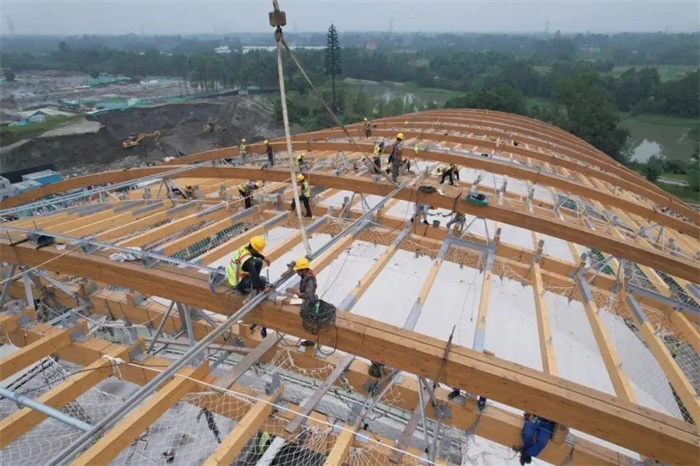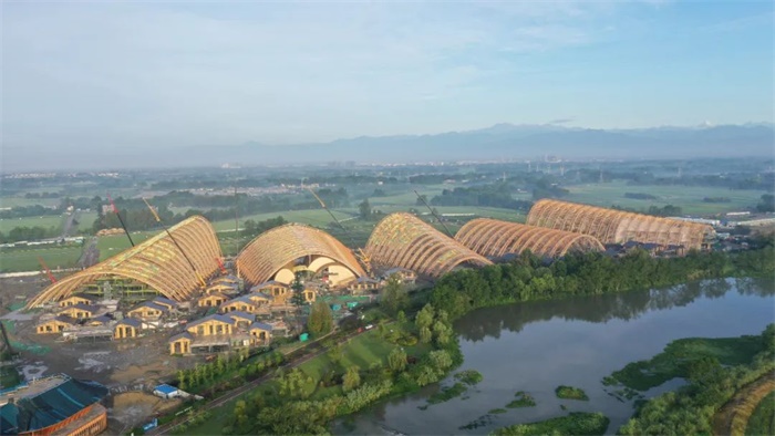 木结构建筑在我国有着悠久的发展史,并且在发展的过程中形成了一套“数字化”建造的逻辑体系。从宋代的材分制,到清代的斗口制,模数制度成为古代木结构建造的核心方法,通过这种数字化的设计建造,采用简单构件即可组合成复杂的结构体系。在当今绿色低碳的设计趋势下,木材作为一种可再生的碳汇材料,被越来越多地运用到建造实践之中。相较于传统以实木为主要材料的建造体系,胶合木结构更适合现代工业加工体系且符合环保固碳要求,已成为现代建筑的主要探索方向。其主要建造方式为预制拼装,具有可变且离散的加工与建造特征,以“文件到工厂”的工作流程,将设计结果通过特定的数据形式,直接从建模软件传递到数控机床或建造机器人上,实现设计、加工和建造的无缝衔接。利用这种三维数控加工技术,能够大幅度提高木材加工精度,并且可将木材加工成复杂的三维形态构件。这为天府农业博览园主展馆(以下简称“主展馆”)的大尺度非标准构件胶合木结构建造提供了技术手段。