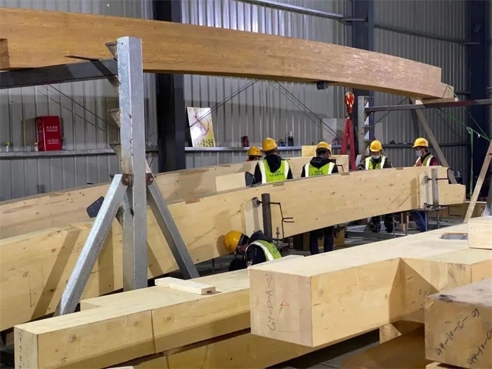 木次梁与主梁的连接并没有采用过于复杂的方式,而是根据数字模型在胶合木弦杆上留出定位槽口,与木次梁之间直接采用高强合金螺钉连接,有效限制了木次梁沿主梁曲线方向的滑移。