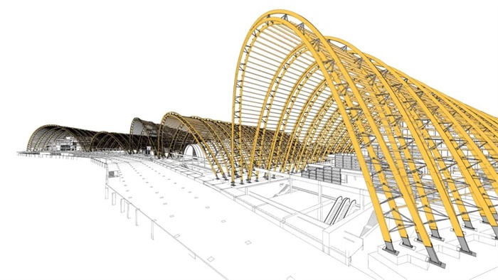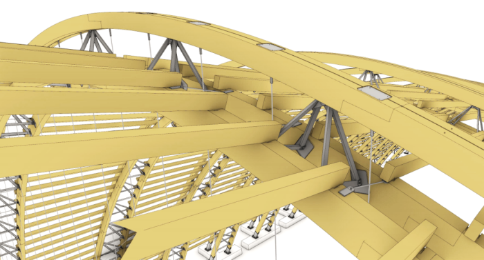 在项目的深化设计阶段,我们与加拿大StructureCraft Builders和上海思卡福建筑科技有限公司合作,基于数字化三维设计模型,对整体钢木桁架进行结构优化、节点设计等深化设计工作。