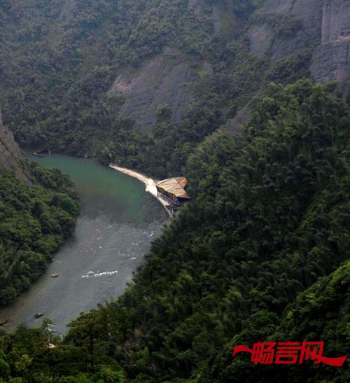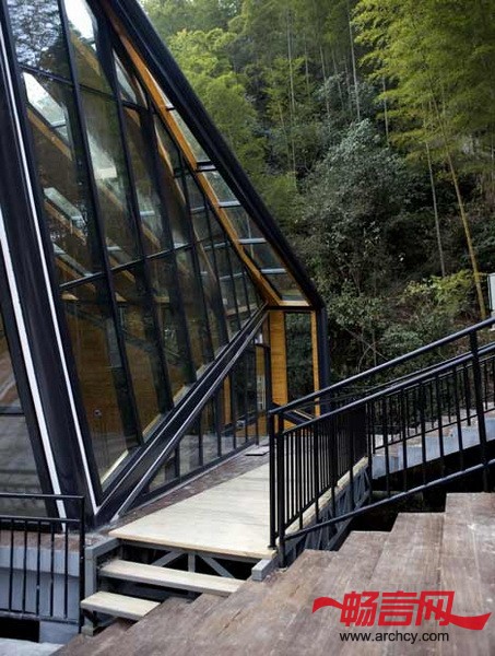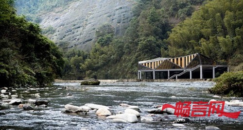 这座由三角形的玻璃和钢结构组成的餐厅位于中国南部一个深山峡谷的小河边上。