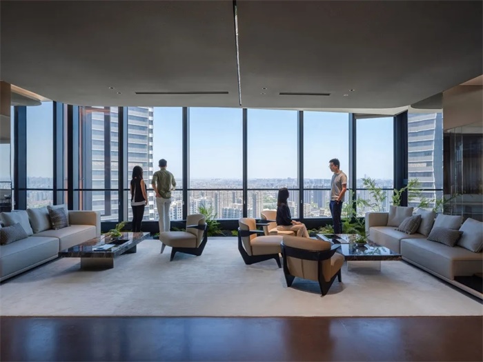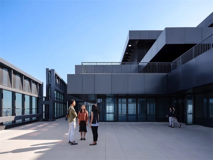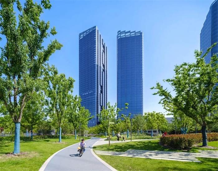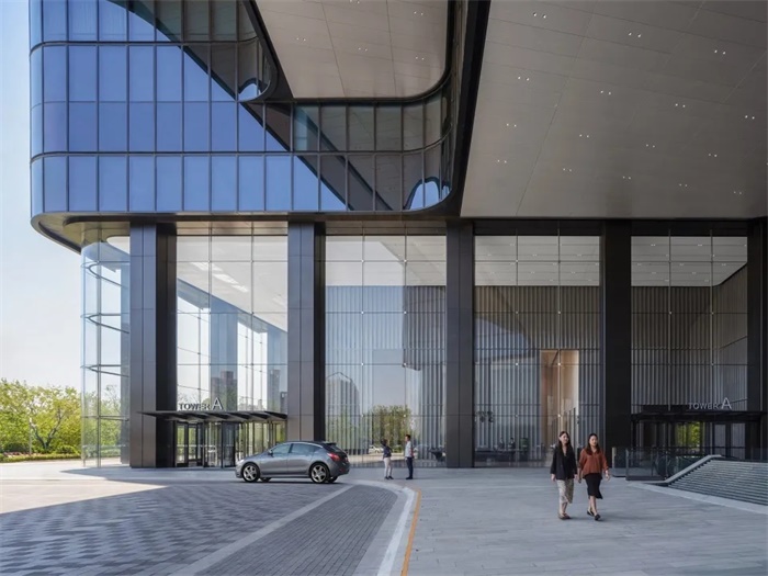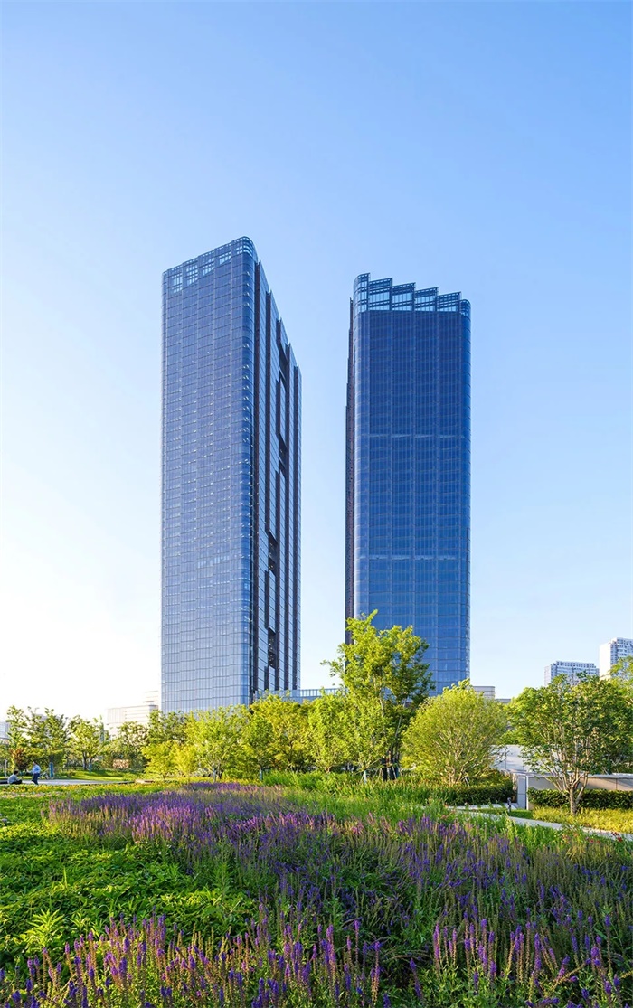 高230米和195米的双子办公塔楼位于场地的西南角,俯瞰场地南侧的真如公园。办公塔楼和商业裙楼在多个楼层连通,为办公人员提供直接进入地下地铁站、首层大堂、购物中心以及裙楼露台层的便捷通道。