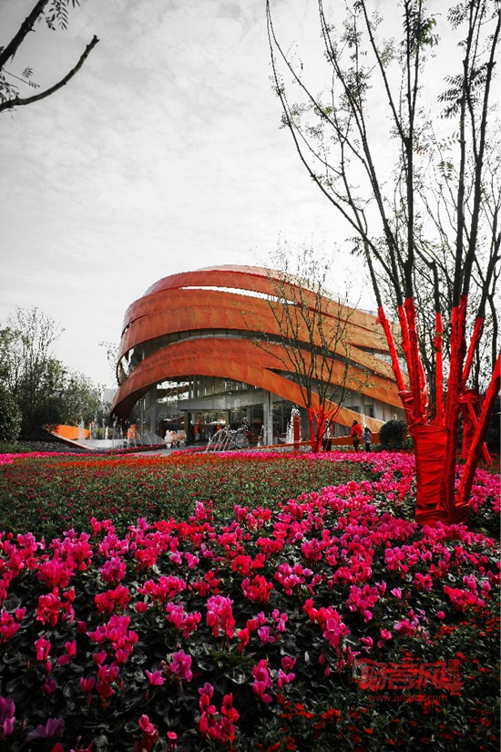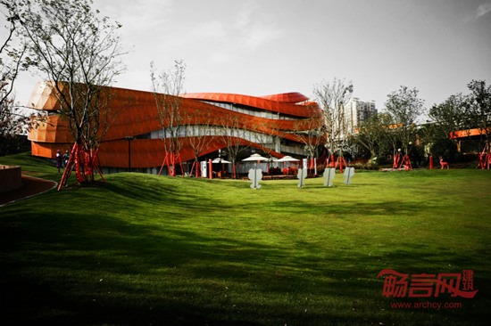 绿地成都航校展示中心售楼处成功吸取了成都地域的丰富性和多样性,探求建筑自身逻辑与艺术。展示中心红色飘带的构思,充满了活力,代表一种未来及时尚感。伊东丰雄曾经提出,建筑发展到今天,不再是永恒的象征,它也可以是快速的时尚的,像其他时尚产品一样,而建筑的表皮正是这种时尚的临时性演绎。兼具标杆性、昭示性、时尚感和超现代潮流,绿地成都航校售楼处经历了无数的方案海选,被否定,再创作,终于成为使各方都满意的成果。