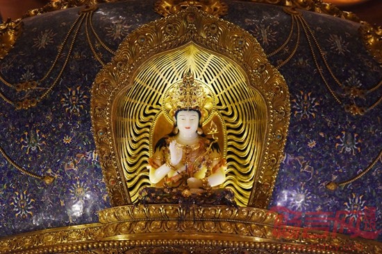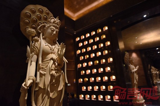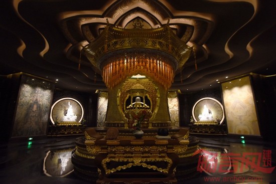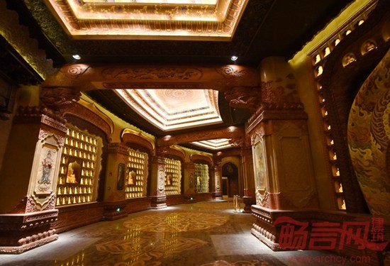在整个空间的艺术表现上,最为突破,也是项目中最大的难点之一是,我们采用了多种不同艺术形式相互结合的方式来呈现。其一,在佛顶宫内使用的艺术形式多达几十种,石雕、木雕、铸铜、脱胎大漆、玉雕、瓷雕、漆画、瓷板画、织锦、丝毯、木刻、新式彩画等等不胜枚举。采用如此多的工艺形式,如何把它们整合到一起,形成一个完整的空间,使得它们和谐共处又各有特色?其二,不仅如此,在单件作品、上,我们还每每和艺术团队一起挑战更高的极限。如果让大师们相互搭台共同完成一件单品,那么属于佛顶宫的艺术是否就会更完美?经过无数次的交流,努力和磨合,于是,才有了如今呈现给大家的景泰蓝的塔身和佛龛中嵌入极彩又鎏金嵌宝的玉雕;才有了莆田的雕像大师和德化的瓷雕大师联手创作的绝无仅有的国内最大整体烧制又格外唯美的四大菩萨;才有了如今种种让人感叹的艺术精品……让更多大师表现出她们最华彩的艺术,同时由能恰如其分控制综合效果和综合造价。我们感恩项目中的各位艺术大师和艺术团队,更感恩和我们一同创造这个奇迹的塑像艺术总控和绘画艺术总控两位大师。