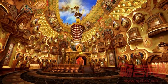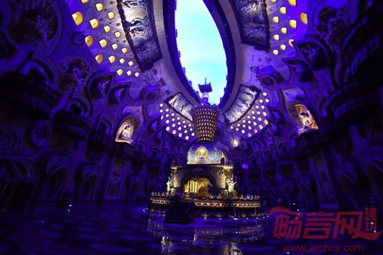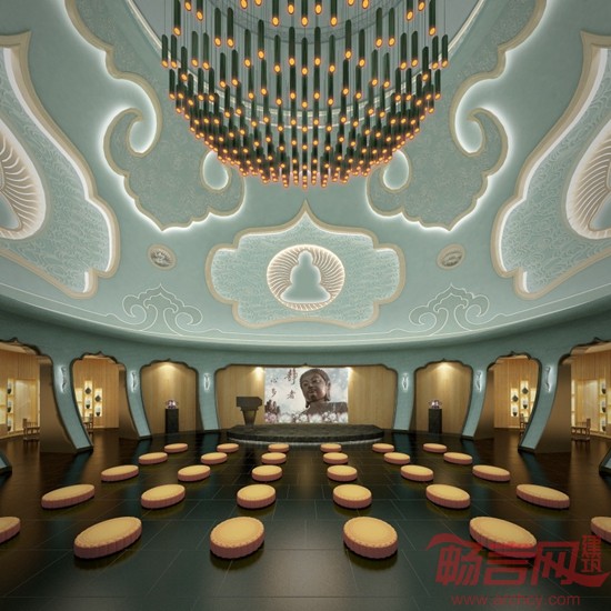 在母题元素的选择上,我们选择了佛教传统的石窟文化作为素材。从印度最原始的阿旃陀石窟,到丝绸之路上的甘肃敦煌石窟、山西大同石窟,再一直到江南石窟,这个艺术形式不仅承载了各个地区不同时期的佛教文化,也极好的体现了佛教西来,又汉化演变的传承和沿革。在禅境大观内,我们主要采用江南化的、近代的石窟形式;而在庄严的舍利大殿,我们则力求还原敦煌全盛时期的风采,同时大量地运用了举世闻名的佛教彩绘艺术,营造出心中的佛国景象。