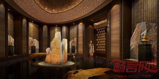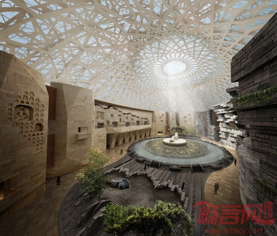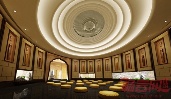 整个地宫共有九层,依据空间气氛分为三大部分,分别由三大核心空间引领,自上而下依次为禅境大观、舍利大殿和舍利藏宫,其气氛从现代禅意的“人间山水”过渡到庄严殊胜的“佛国天宫”,最后归结为神秘幽远的“宇宙佛种”。依据这条主线,我们和文化团队、艺术团队将文化的安排,艺术的分布恰如其分的布置在空间当中,使得在这个项目中,文化和艺术的表现能够和空间充分的融合,各自合理。