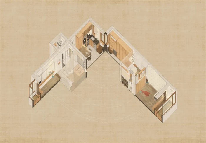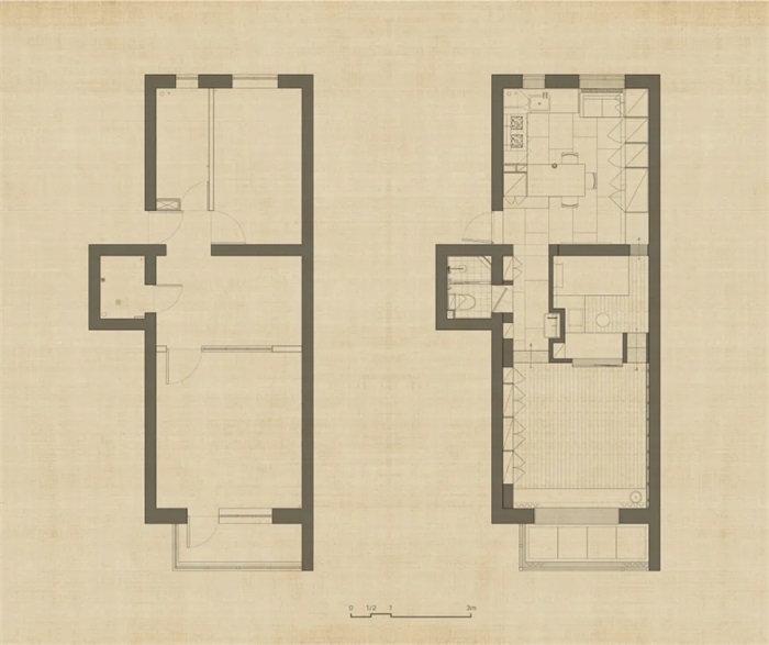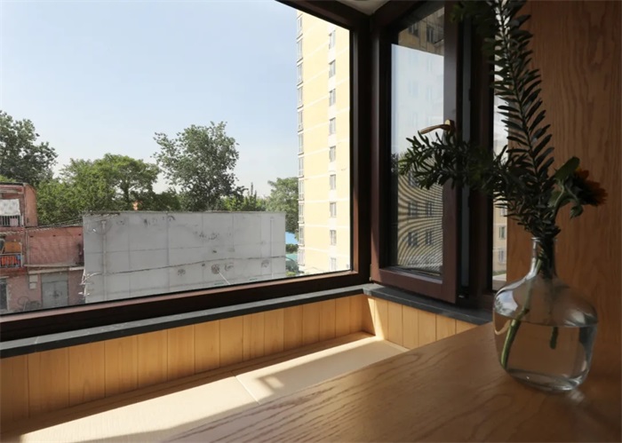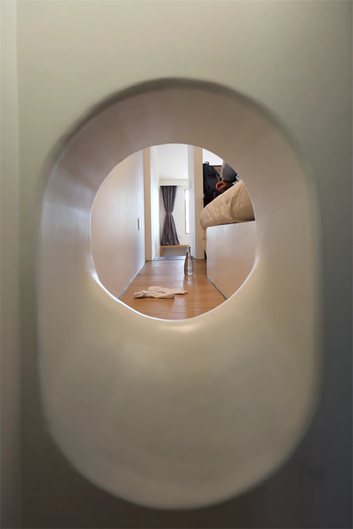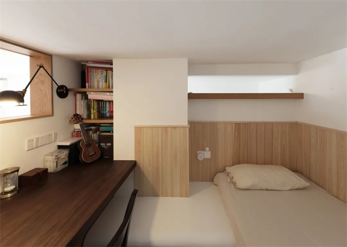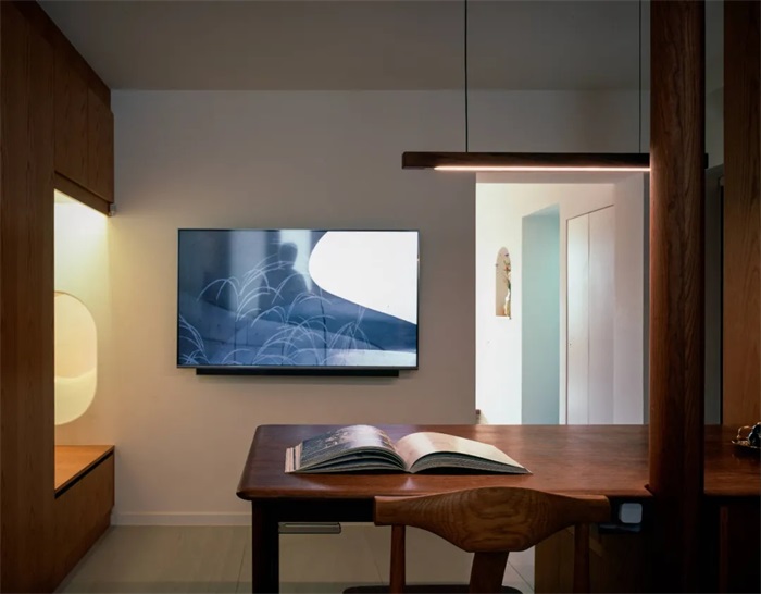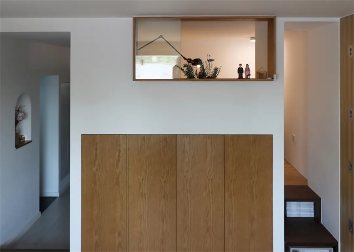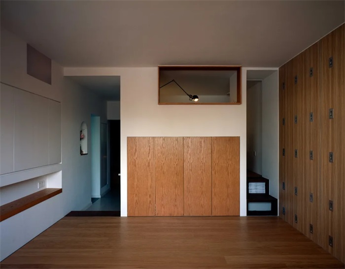不能开门,是否可以开一个“兔子洞”,小朋友学习累了,可以从那里溜到客厅,外面设一个卡座,也不会摔到屁股。这样一来,塞在中部的“大家具”就被一条循环路径连入室内的空间系统中。这个兔子洞,在生活中或许很少用到,但在感受上却成了不可或缺的一笔。此洞一开,空气和身体都在这一刻流动起来。