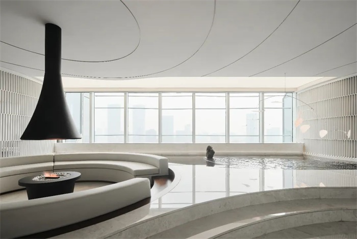 设计初始考虑两种不同使用的方法, 首先以功能划分出动静两种不同的视觉属性,顶层面向黄浦江的区域,在原始的方正塔楼格局架构下,让自由的弧形进入空间,弧墙交错之间,转换了原始结构的方形局限,形成了不同的社交活动空间;另一侧主要静态办公区,维持矩形的入口,内部大小会议空间动线分明,主次办公区进退有序。