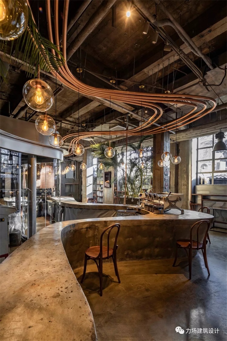 大厅保留和修复原混凝土墙面、顶面及柱子;顶部以管为元素设计与吧台同轮廓的水平向金属管装置,其中一根管内接通水路,再由三根竖向管将水供应给吧台;金属银灰色外壳,透明玻璃的烘焙间内含夹层,夹层上方可作为储藏也可以作咖啡培训空间;烘焙间内有一台烘焙机运转,整个烘焙间从声音、颜色,材料上共同营造咖啡店“当下”的工厂状态。