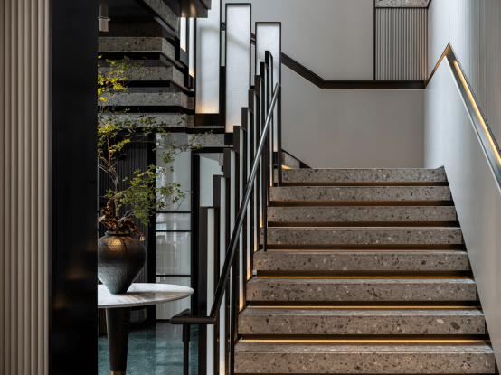 在楼梯工艺上,设计师运用石材的切割和堆叠形成几何感十足的交通空间,配合错落有致、带有上海印记的钻石纹艺术玻璃,呈现空间中的线条魅力。楼梯自带含蓄温柔的莹莹珠光,拾级而上之时,竟有几分探访世外桃源的期待。