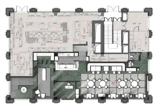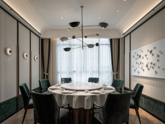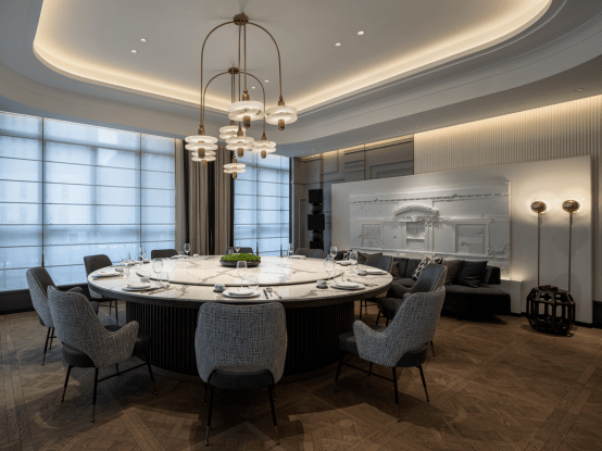 雅座设计充分借鉴了海派美学观念,也回应了含蓄内敛的东方风格。清雅沉稳的色调应用于不同材质,呈现出丰满而不凌乱的空间视感。