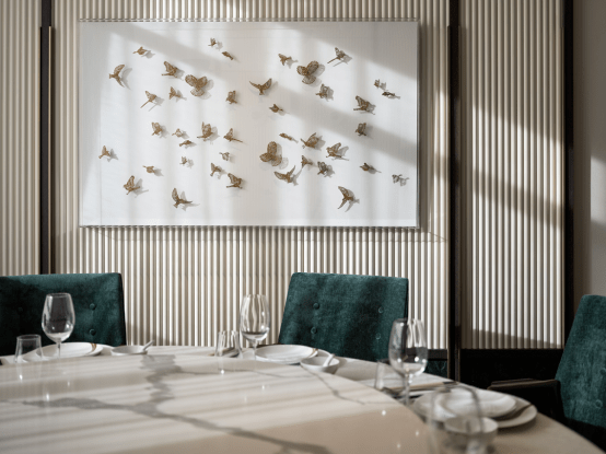 海藻绿大理石与深木纹门户,带来了装饰主义的西方格调,静穆而典雅。包厢拉手为手工吹制玻璃制成,内嵌金箔,轻灵华美,令人期待接下来的专属用餐体验。