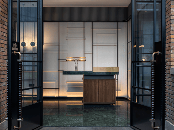 入口处红砖结构还原石库门的造型,黑色框架线条的融入增加了现代意味,复古与摩登的张力在不同材质的组合中释放。迈入典雅的大门,时空就此融汇交错……
