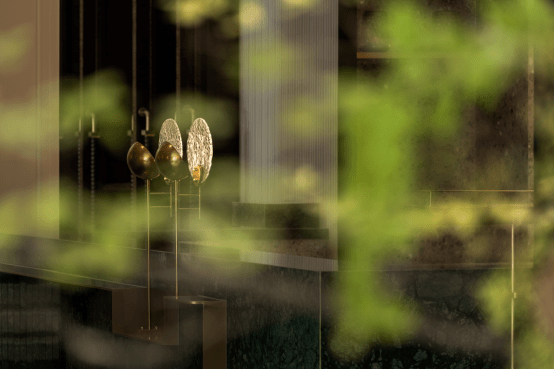 铜质的线性造型点缀于餐厅的各个角落,是风景,亦是空间的划分依据 。线与面的组合、点与线的较量,铺陈开流畅的室内动线,共同铸就空间的内建筑感。
