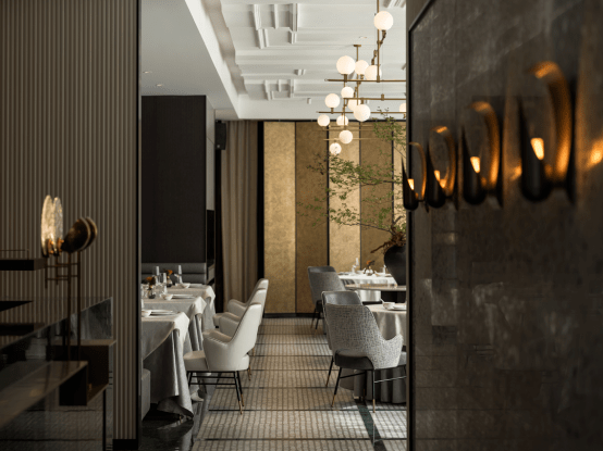 凛冬悄然而至,赖以温存的迷人温度,来源于食物,也来自于暖调的柔光。设计师以多种形式优雅呈现“光”的主题,让门厅成为光与影嬉戏之所。灰调的木、曲线婀娜的壁灯绽放着落日余晖般的暖意,氤氲流光邀请着宾客的步步深入,也呼应那一缕期待的雀跃。