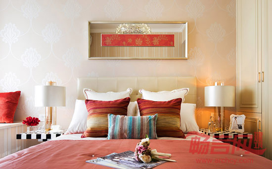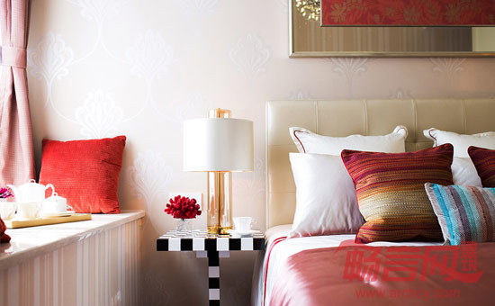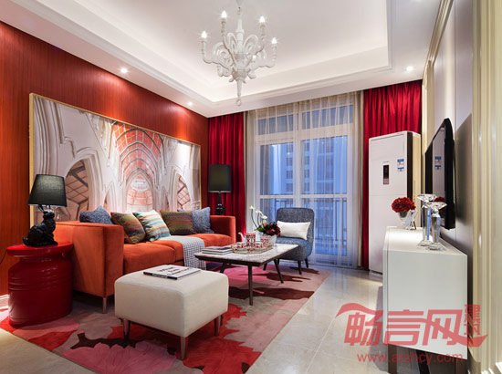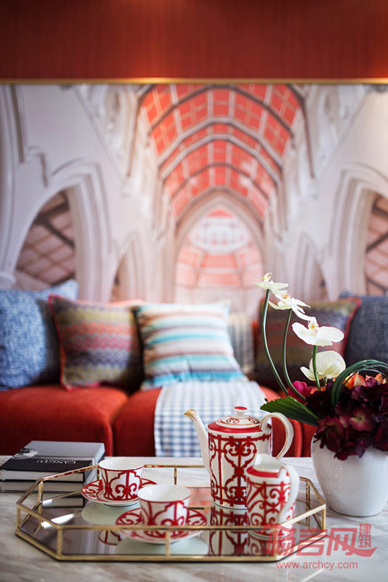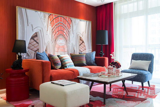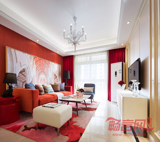 本案在设计处理手法上,利用色彩与材质在不同体量上的表现,强化了空间形体,体现不同空间的个性,运用红色与米色两种颜色为主的墙体界面进行穿插处里,强化了空间形体的变化。大量刚直的线条与块面穿插处理,偶尔出现些柔美的曲线,虚与实,刚与柔,明与暗,这些元素与墙体进行质感对比的同时,更加强了空间中的视觉层次,让空间的美感在不断变化和转折中尽情呈现。