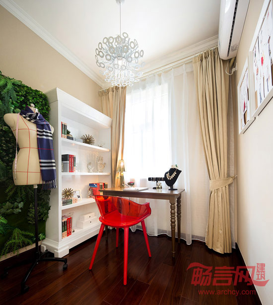 书房是一个设计师家庭并不可少的空间,人的一生,应该是一个跋涉的过程,一个努力的过程,并不是因为结局的无法预料而放弃努力。为了在家创造一个舒适的共享的工作环境,书房配有古典造型的书桌加上MAGIS经典款座椅,两边的书架上放着男主人的摄影杂志与各类书籍,将自然延伸进房间书柜中间的植物墙,立着女主人的人台。整个空间给家庭生活填色不少。