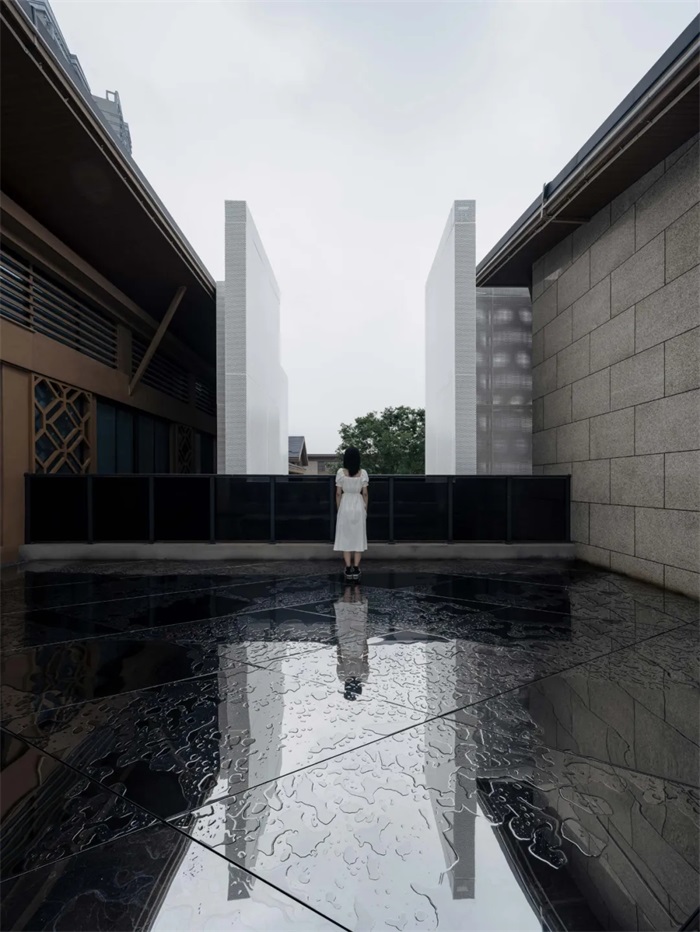 书院选址在永宁江边上一组4栋建筑中的1,3号楼。1号楼也是由两栋建筑在首层相连成一体的。公共空间场地设有地下室天井和疏散楼梯间。是一个焦点分散而没有重点的场所。传统有规模和形制的书院都是一组有序的建筑群形成的。我如果把分散的1,3号楼以及内部空间看成传统建筑群里的亭台楼阁和庭堂轩榭的类型,那么显而易见这样的建筑群缺一个作为重点的院子。既然我需要一个空间来控制这些分散的个体,那么创造一个庭院类型毫无疑问是我的自然而然对的选择。