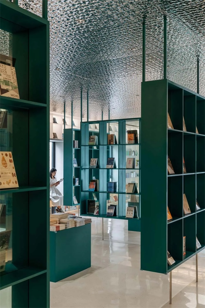 为增加迷宫的迷惑性,我用波纹铝板作为吊顶仿佛波光潋滟的永宁江水。同时把收银台区域的屋顶平台变成一个能够反射天空的镜面。我用把水面和天空浓缩在一层楼板的正反面上去创造一个失去方向和时间判断的场所。
