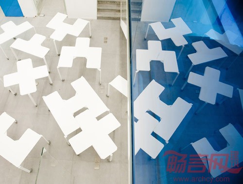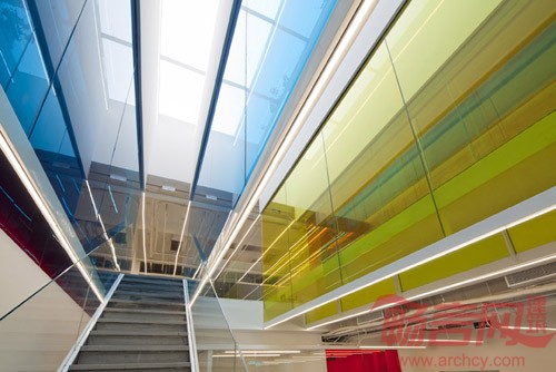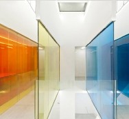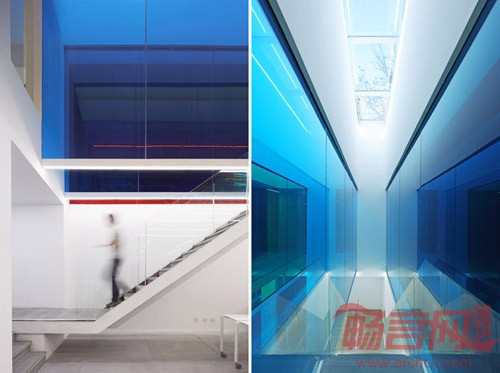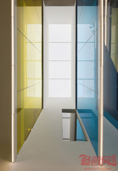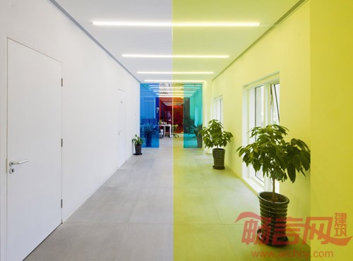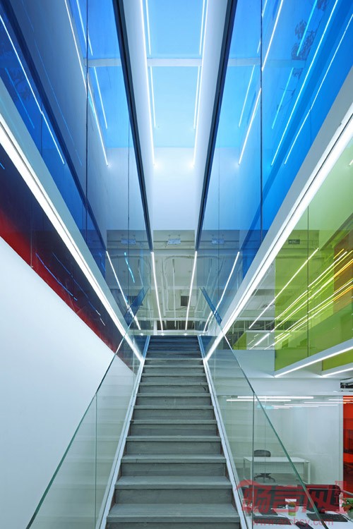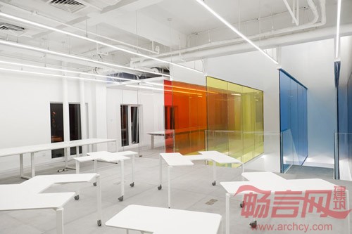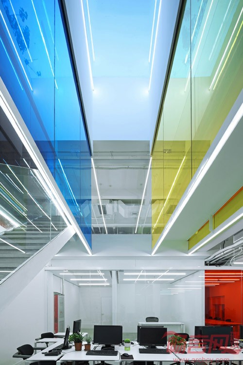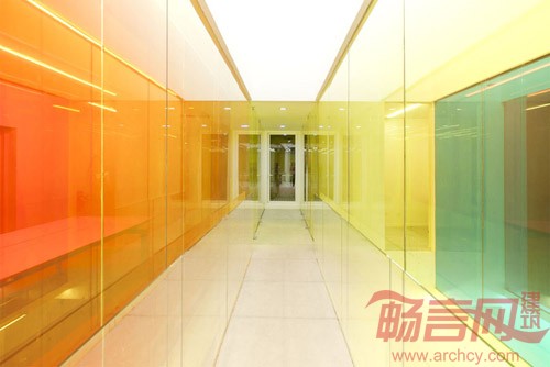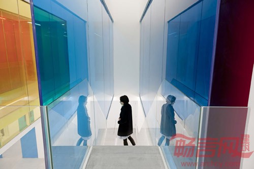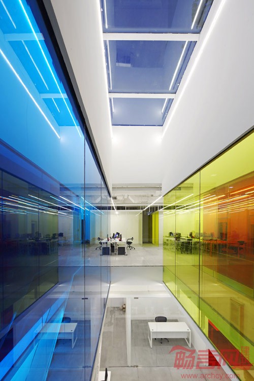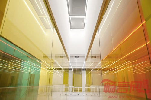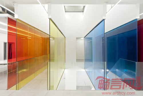 “廿一客”是国内新兴的蛋糕食品专业公司,我们为他们设计了北京办公总部的室内空间。设计师利用红、黄、蓝三色的叠加与渗透,在空间内部填满各式各样的色彩效果。方法是将行走路径面对或侧旁的墙面设计为不同的彩色玻璃,通过人在空间中的移动,观看玻璃的角度与层数的变化,颜色的叠加及光线的各种反射,构建出一个无比虚幻的色彩世界。而二层通高的中庭是这个世界的中心,因为有直射的阳光和更多层的彩色玻璃,能够形成最为绚丽、玄妙的色彩效果。