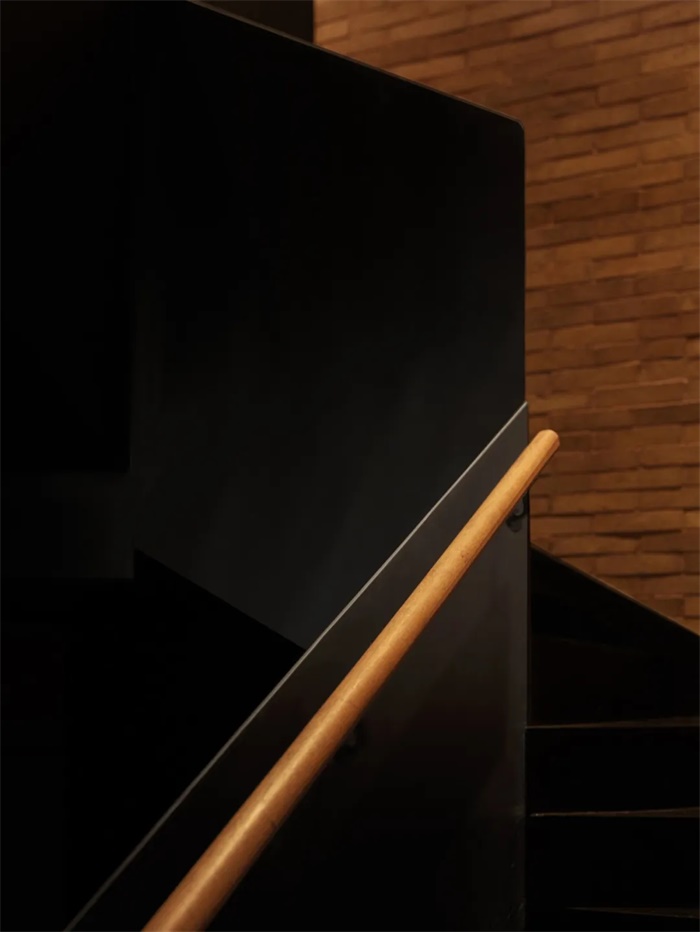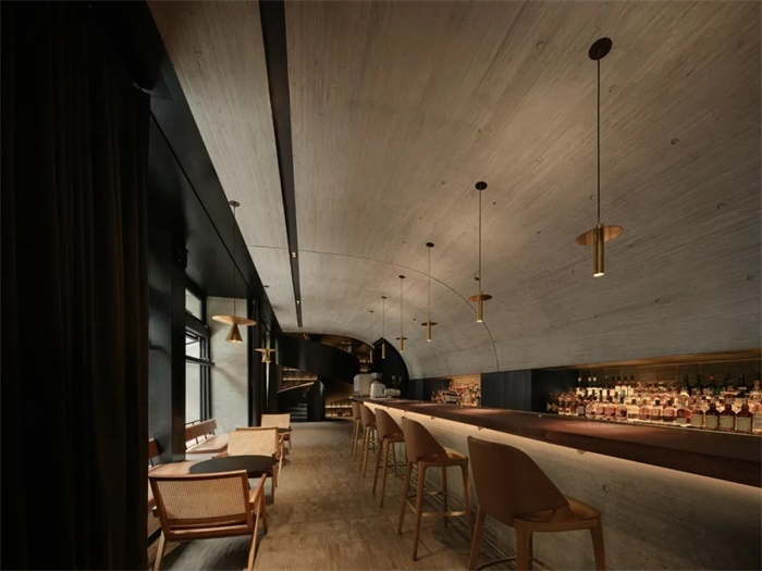 混凝土的选择是自然而然的,它是一种恒久的材料,随时间的流逝而变得愈加优雅。在一楼,混凝土与灰色的青砖地面结合在一起,砖的色调和纹理与墙壁天花的木纹混凝土相互呼应匹配。青砖也使我们联想和感受到更多的公共空间氛围感,缩小了酒吧和城市之间的距离。