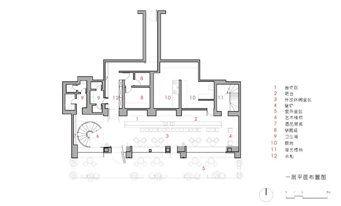 项目开发的目的是为城市创造一个酒吧,一个向周围环境友好开放的聚会场所。为了突出酒吧与街道的朝向关系,一层的主要活动区域由一个巨大的混凝土弧形天花板覆盖,采用就地浇筑的悬挂形式,同时可从有限的建筑结构中分离和遮挡后方服务空间及所有设备机器和管道。