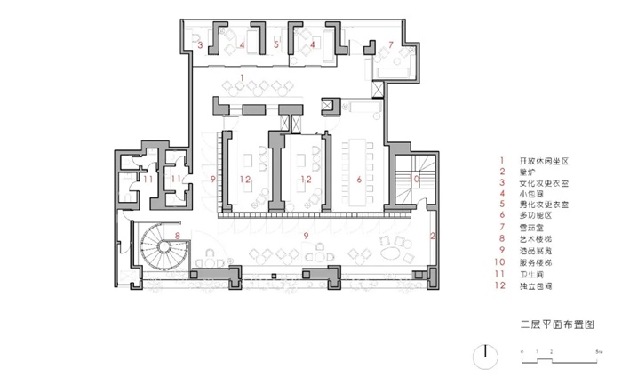 离开热闹的一楼和它的城市氛围,通过一个艺术雕塑般的螺旋形钢制楼梯走向二楼,在这里展开为一个更亲密的空间氛围。为本项目特制开发的钢架展示系统,不仅创造了空间不同单元之间的微妙分隔,同时也为品类繁多的威士忌提供充分的展示空间。