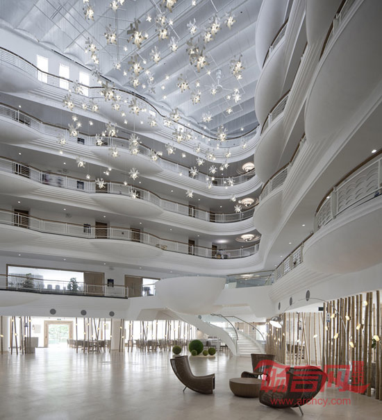 从经济成本和设计意图两方面考虑,我们绝大部分应用最简单的白色涂料,选择当地基本的铺装材料,追求空间简约的同时,又可凸现设计感。色彩的过渡带动了材质的变化,带有反射光泽的玻璃与粗糙的石材表面和天然亚麻材质形成对比;高光泽度的石材又与渐层木纹表面形成强烈反差,丰富了空间层次。半空中星星点点的灯光点缀了整个中庭,在波浪般的场景下,犹如各式各样的海洋生物在自由自在地畅游。