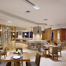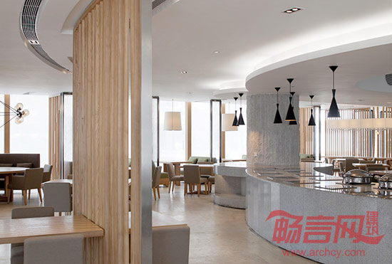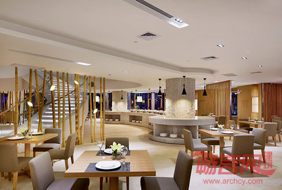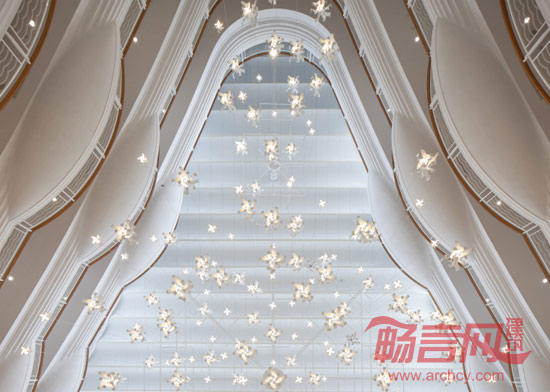 值得一提的是,在中庭与西餐厅衔接处,我们也以最低成本,巧妙创造出如竹林般的天然屏风,生动的犹如海洋生物般的灯具点亮了这片竹林,既能恰当地遮挡过往人群的视线,又能将餐厅内优雅的氛围流露出去。西餐厅的色彩组合汲取了大自然的造物灵感,让整个“自然海洋”的主题风格更加形象化。同时,我们大幅度去除了中庭原有的欧式古典楼梯,变为莹白、淳朴的碗状“鸟巢”形式,与波浪般的建筑形态浑然一体,纯净而独特,带来别样的视觉亮点。