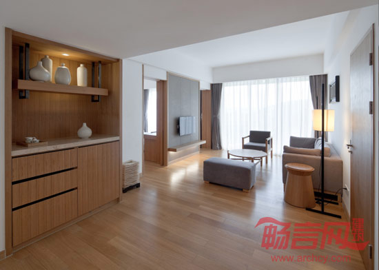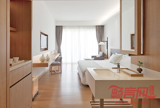 设计师希望通过简约、纯粹的空间营造置身自然之美的惬意,令客人得到放松、愉悦的难忘体验。在莹白的大堂空间里,藉由木纹与光影,构筑了简洁的主体线条,并充分调动阳光与空间内部的颜色互动。酒店的客房面积非常小,我们也相应采用了开敞式的设计,尽量放大光影对空间扩张的作用。阳光穿透落地窗的白色纱帘,洒落在墙壁与地面之间,随着时间推移变幻不同的表情,交错出大自然的抽象画作。