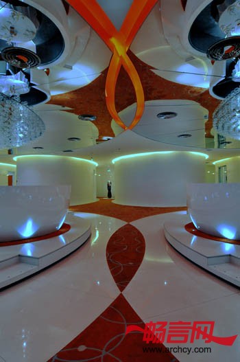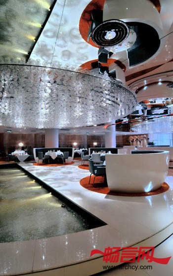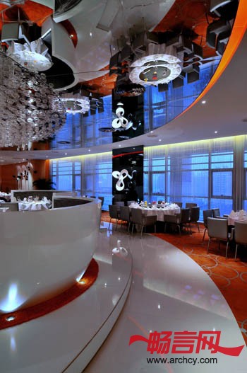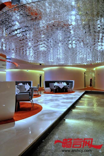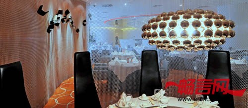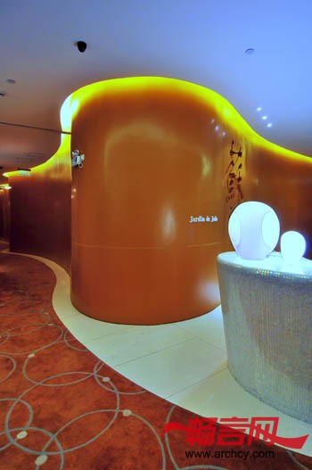 此餐厅设计倾向一套新意念,以“弧形” 为中心概念,打破传统中式食府的方正框子。空间的种种限制也是考虑在内,包括密封式及高度不足,反而让设计师灵机一动,以“开放式”的手法提高灵活性。时代感的雅座设计,没有固定的间隔墙,善用现代化的半透明网状物料,模糊式划分的飨宴位置。空间色调以鲜明的橙色为主,营造一种个性化的格调独特的主大厅设计,镜面天花令视觉上增加空间感,以万颗灯泡的巨型天花灯,夺目耀眼,中央雅座设计如主题公园之咖啡杯,充满趣味性。虽然,眼睛看上去,这是不能动的;然而,内心却感受到欢乐的喜悦。