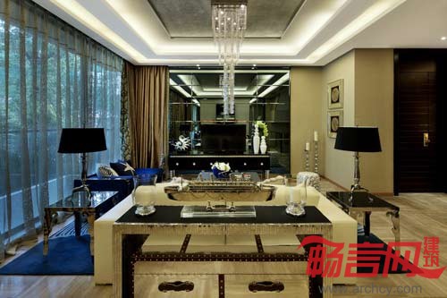 一套尊贵奢华的落落大宅,因为被设计师注入了海的元素而变得浪漫迷人,就像航行在大海上,随处都可以嗅到海的气息。