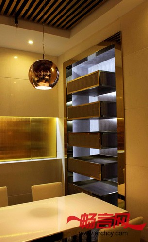 首先主入口的处理我们考虑怎样能与原来大厅相协调而不突兀,通过材质和灯光的处理很好的解决了这个问题,进入走道两边的金色画框与玻璃的完美结合很巧妙的把原本枯燥乏味的墙面进行了艺术化处理,完全诠释了金库的主题风格。