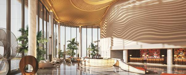 形态的考虑从沿街的界面入手。建筑的一侧被金属网覆盖,形成一个半透明的体量,与水平线条的灯带相呼应。酒店室外景观配套部分,在地面上设计了与品牌导视系统结合的彩绘,引导行人、车辆进入酒店空间。