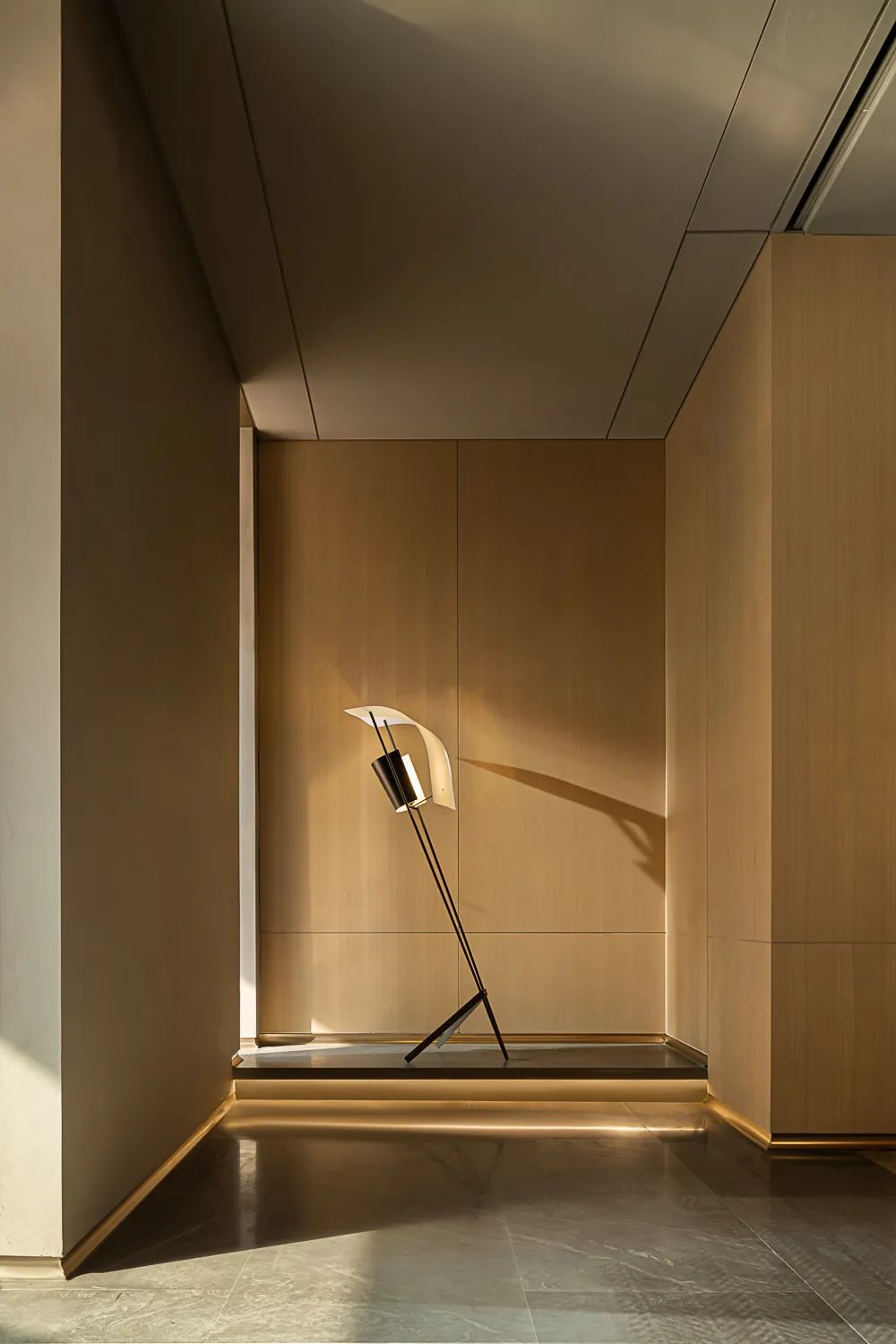 顶面的金属材质形成一种低调、奢华的品质,柔和的灯光为整个餐厅空间形成了一种电影般的氛围,最外侧的金属杆件仿佛几根疏密有致的竹子,将婆娑的竹影和江南的温润投射到室内空间之中。