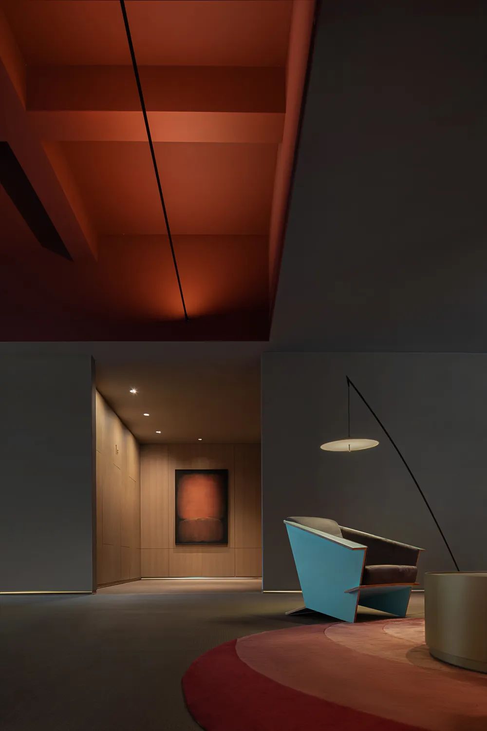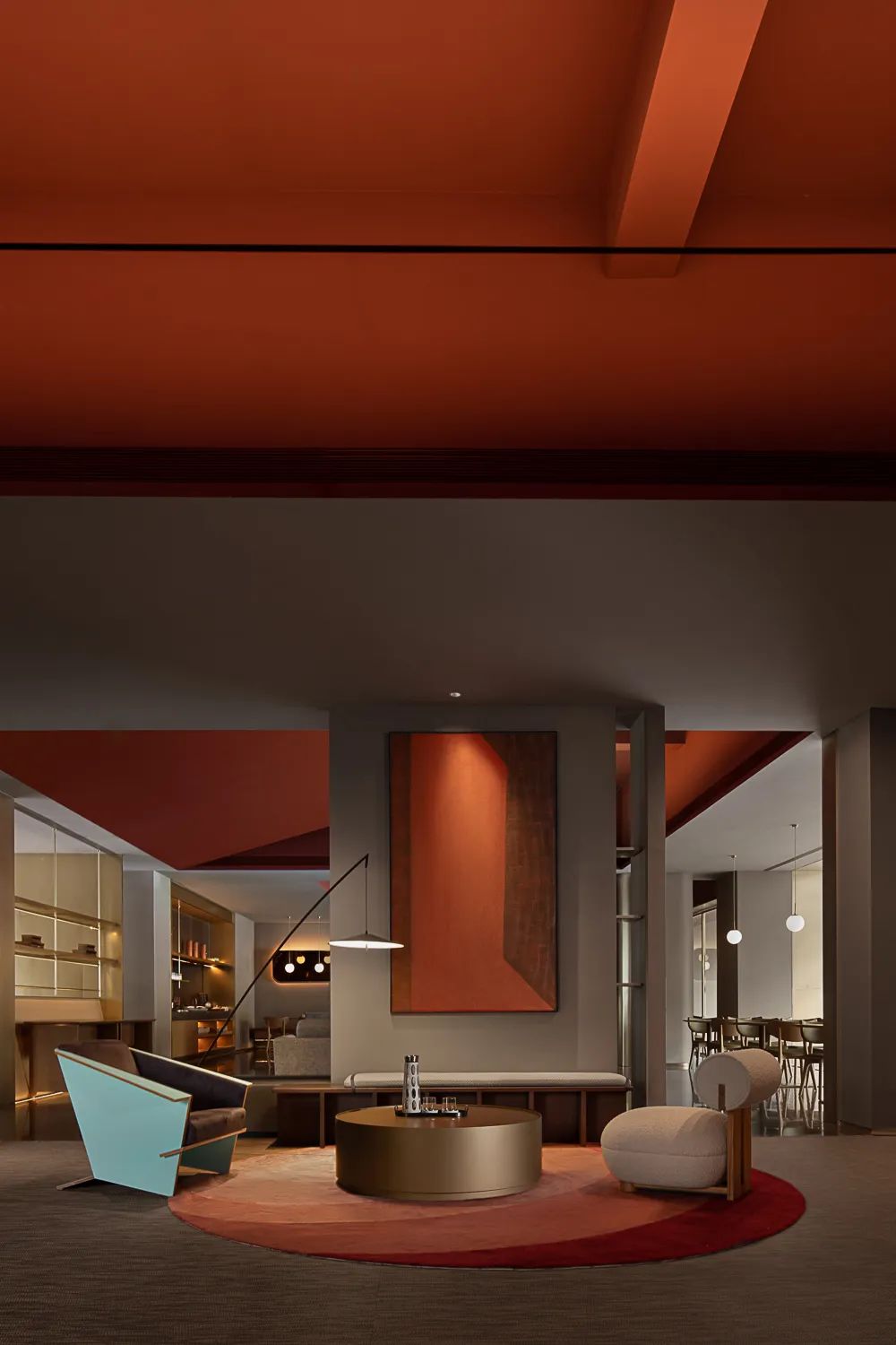 在首层的设计中,沿街的入口空间向内退让,形成强烈的引导性和欢迎的姿态,与旁边的餐厅共同形成完整的橱窗感,与室外的城市形成一种对话的关系。
