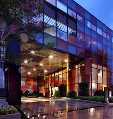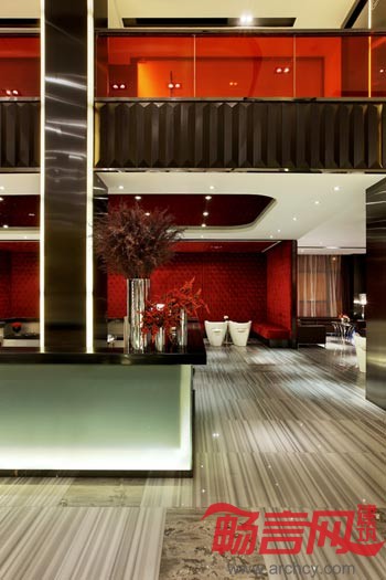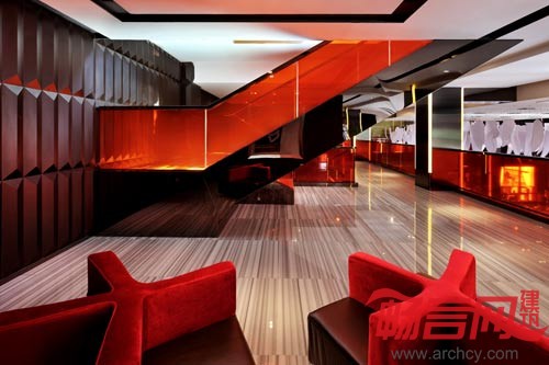 舞动的红色是热情与活力的象征。红色的玻璃楼梯扶手,红色的洽谈区软包墙体,红色的家具,是青春燃烧的火焰。在深色木饰面及黑镜钢的陪衬中,红色以极富动感的姿态连续出现,像一条红色的飘带一样贯穿着空间的各个领域。